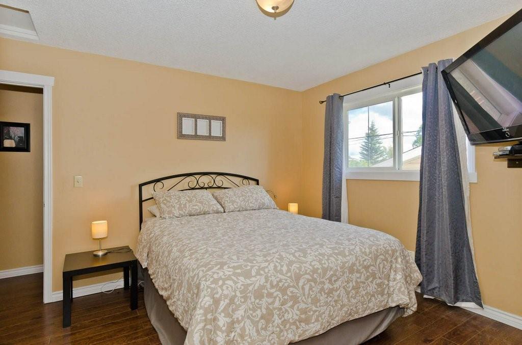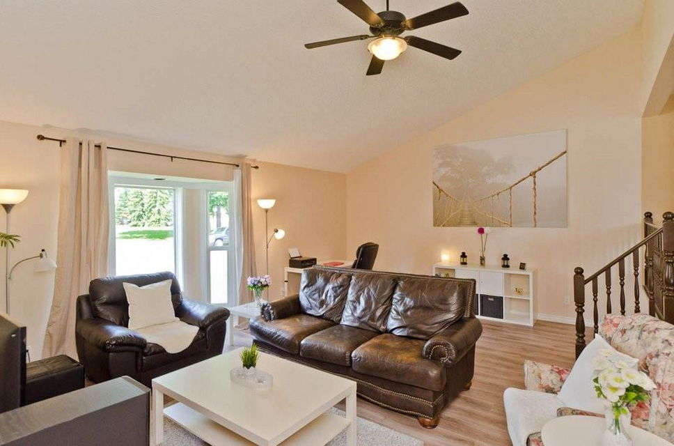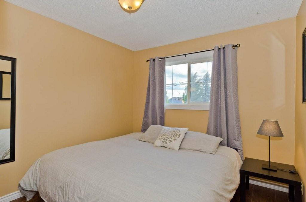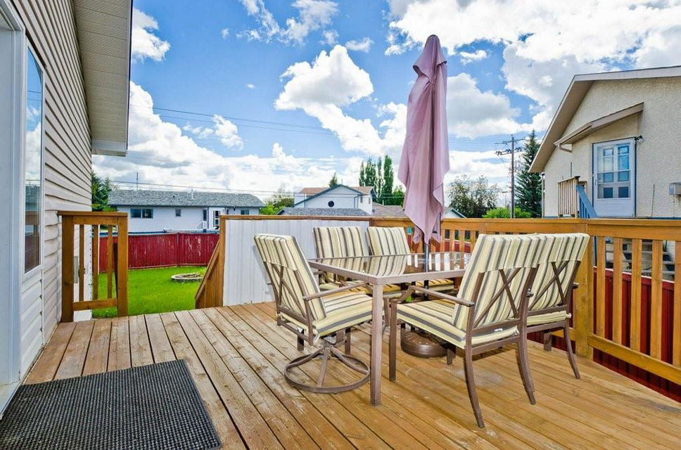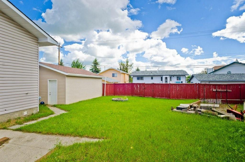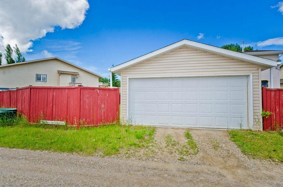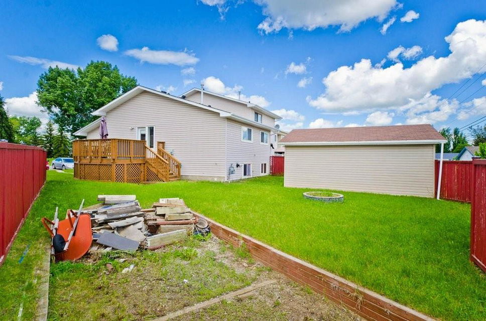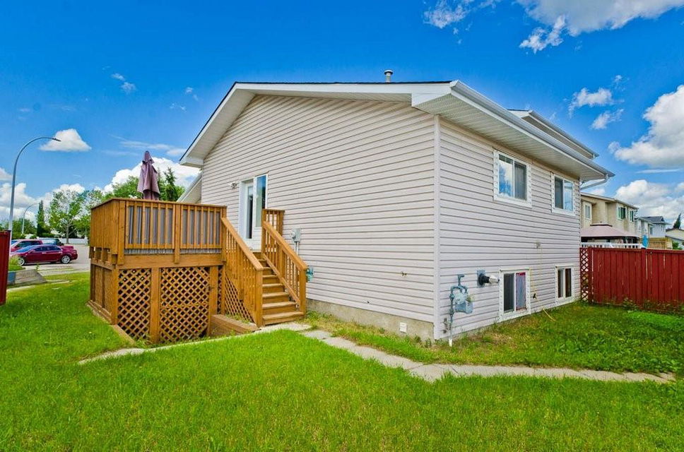 Great opportunity to buy your own home! This bungalow situated on a pie shaped lot is a great price! Lots of natural light with big windows and vaulted ceilings. Tons of room on the main floor with a big living room and a few steps up to a formal dining room. The kitchen has lots of cabinet and counter space, stainless steel appliances and is large enough for a table. Step outside onto the deck overlooking the large backyard. 2 bedrooms on the main floor including the spacious master suite with 2 piece ensuite. The lower level is developed with a log cabin feel with a rec room with gas fireplace, 3rd bedroom and a huge 4 piece bath including soaker tub, ample storage and laundry area. Tons of room on this pie shaped lot for a fire pit and toys. Double detached garage and additional parking space. Close to a park, schools and amenities.Bonus — All fresh paint and New Roof last year