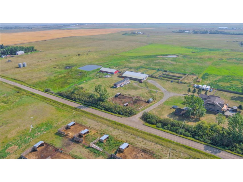 40 acres west of Strathmore just off hwy 1 complete with loads of mature trees, a large 4+1 bedroom, 4 bathroom fully renovated and developed bi-level home, 2 nice shops; one currently used/set up for a dog kennel, one is used for storage. Mobile home for kennel staff on permit. Land is fenced with corrals and balance in hay. Good well and septic systems. Property shows well!